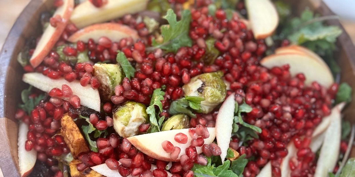 - Start with a layer of kale, and then layer in a small amount of all your salad ingredients but save most of them for the top, layer with more kale and then carefully arrange your ingredients. I cooked the veggies, and then artfully arranged the apples, & pomegranate seeds on top.