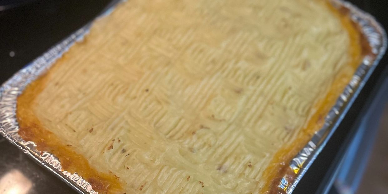 Add the mashed potato on top of the meat mixture and spread evenly.